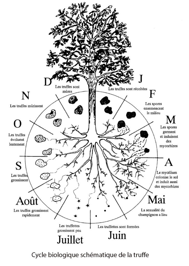 Le cycle biologique de la mélano (Tuber melanosporum) est assez bien connu. Les truffettes naissent en mai et juin, grossissent principalement en août, sont mûres surtout en décembre, janvier et février.